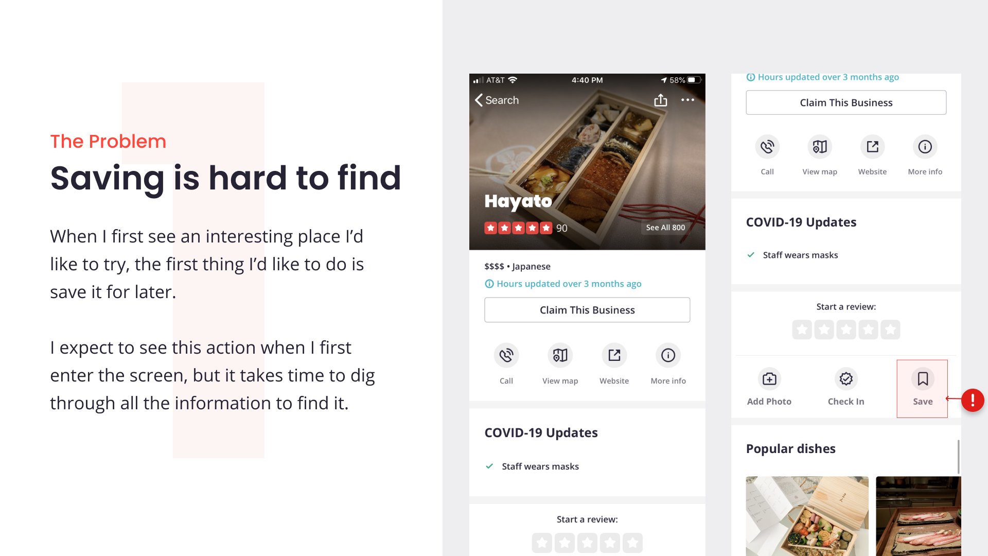 I also ran users through a user test of the current Yelp collections workflow to identify pain points to iterate and improve. This also helped me establish a baseline to improve against.